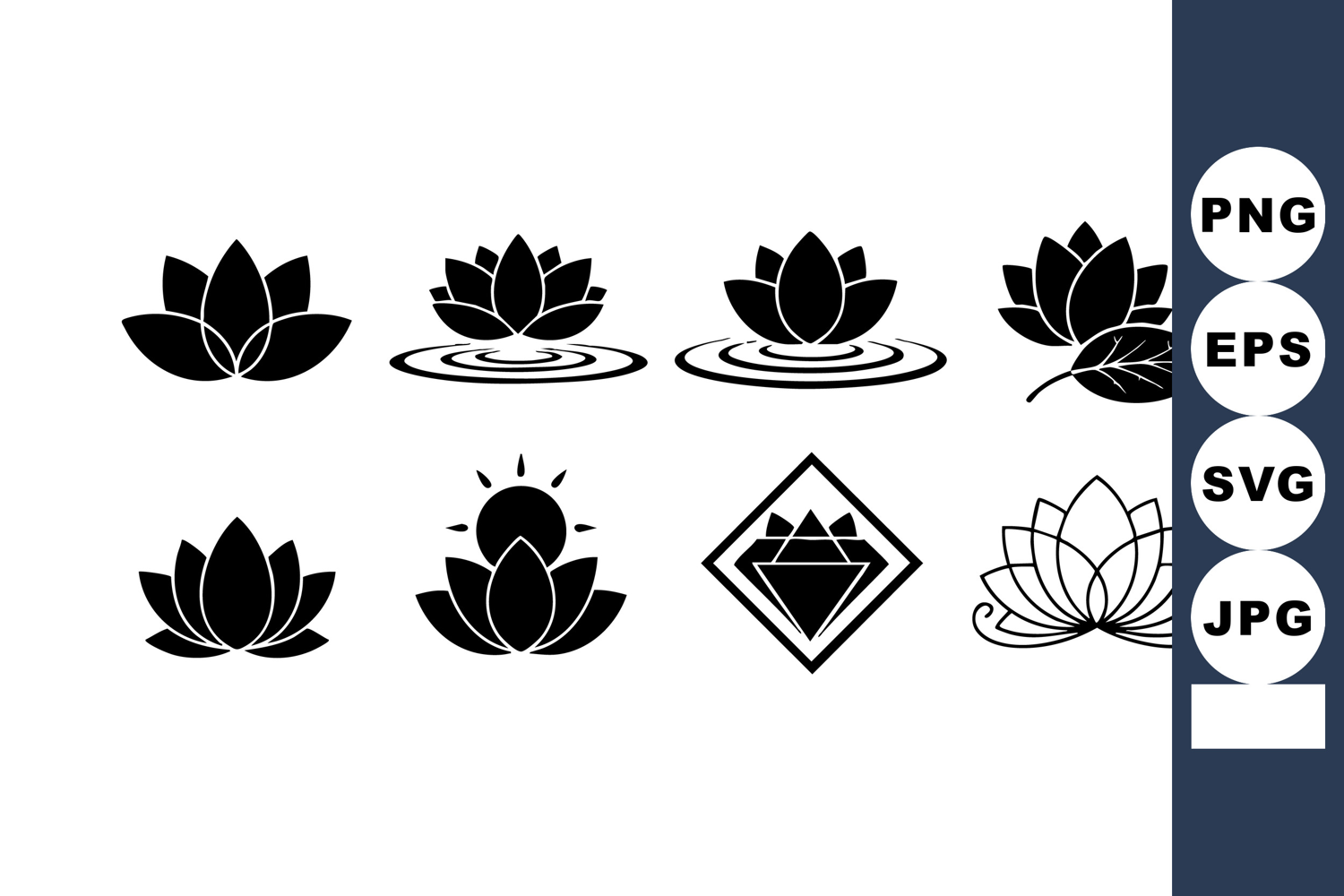 This vector illustration shows lotus flower icons with water ripples and a diamond shape, designed in black and white for versatility. Calm and elegant.