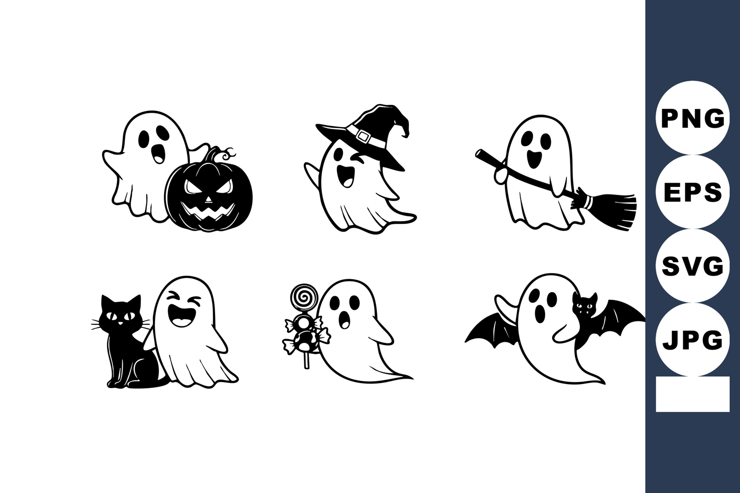 Vector illustration of six Halloween ghost characters with a witch hat, broom, pumpkin, bat, and cat, evoking spooky festive mood.