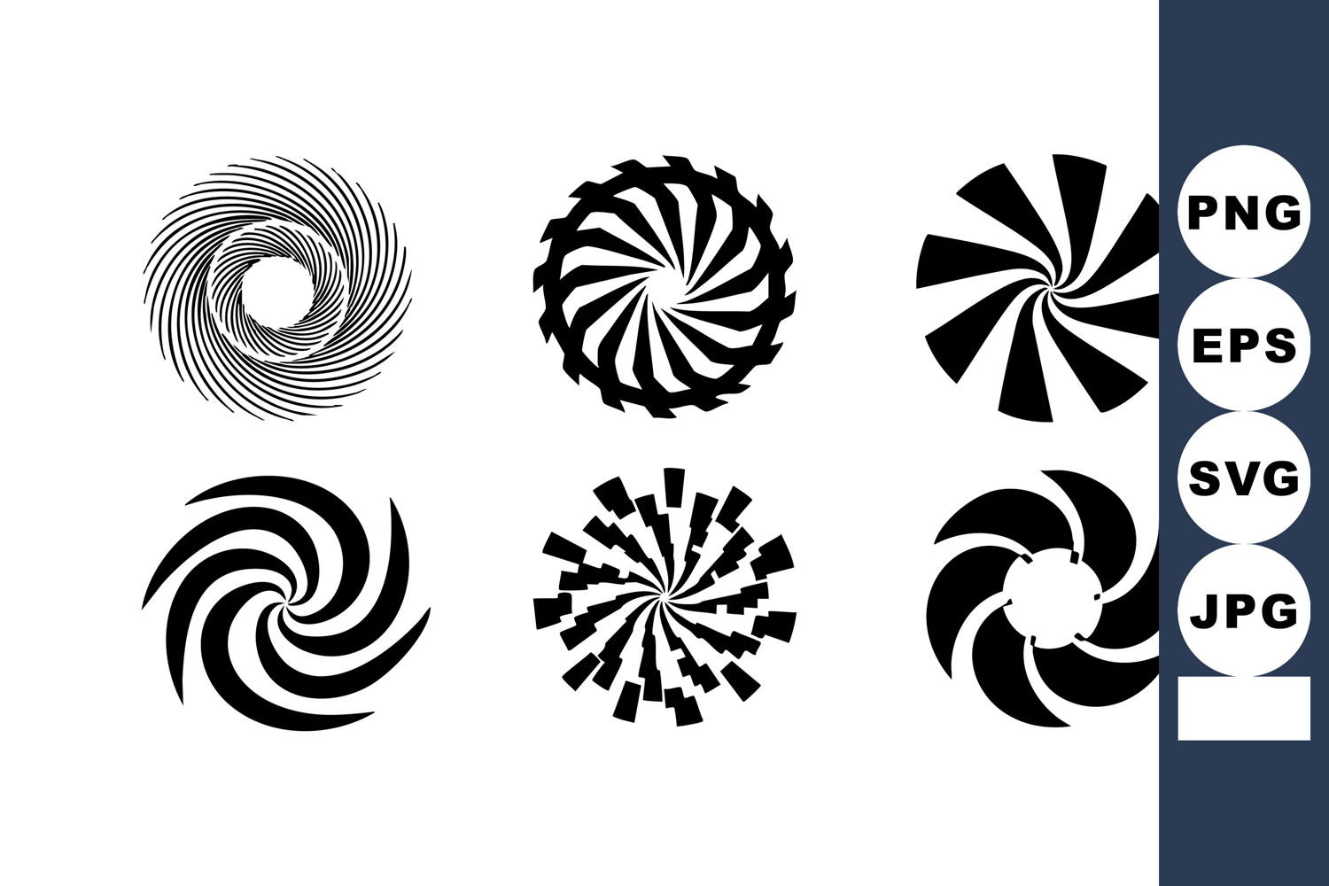 This vector illustration presents six distinct black spiral swirl shapes with circular geometric patterns on a white background, creative and dynamic.
