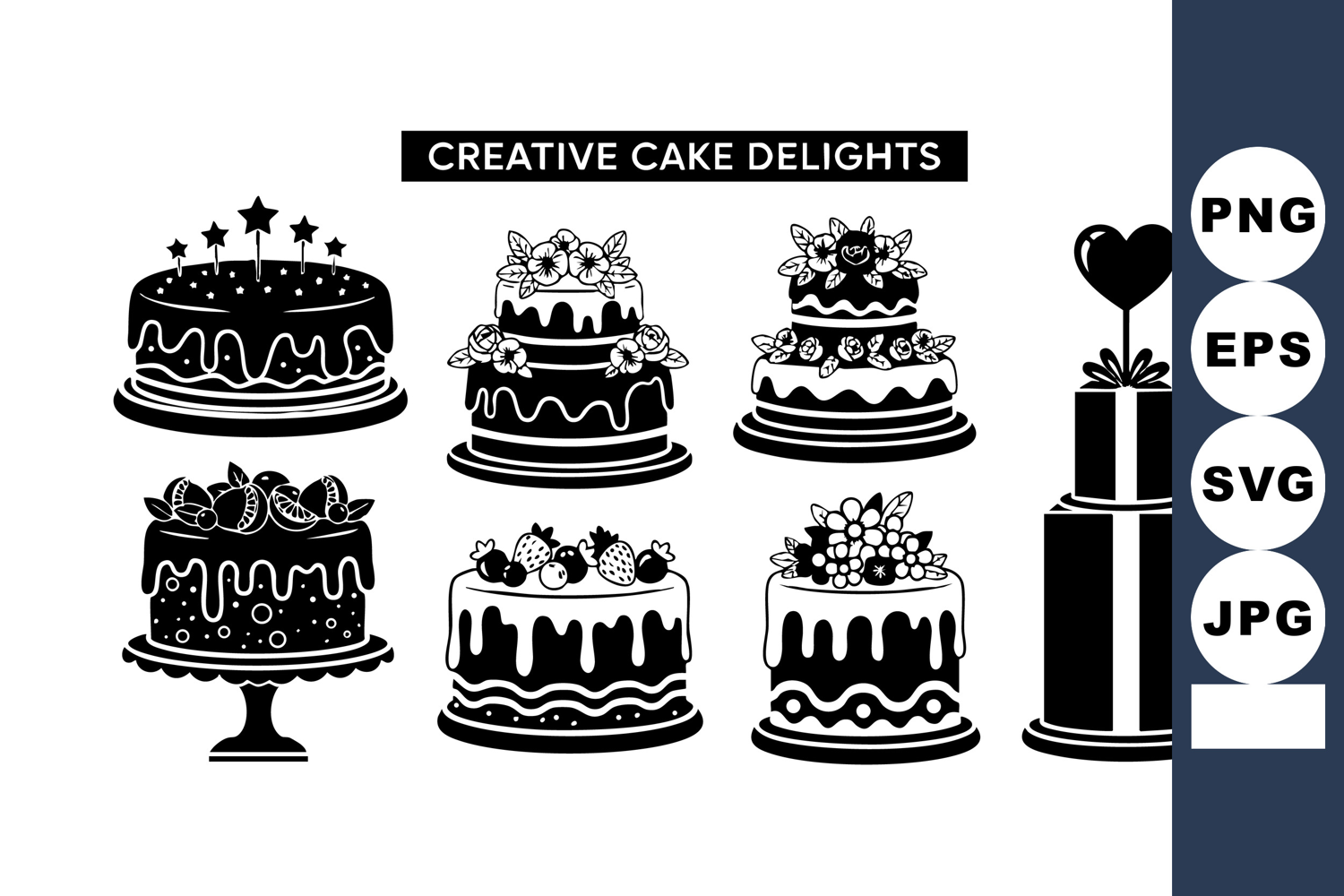This vector shows six creative black silhouette birthday cakes with various decorative toppings and a gift box, conveying celebration and joy mood.