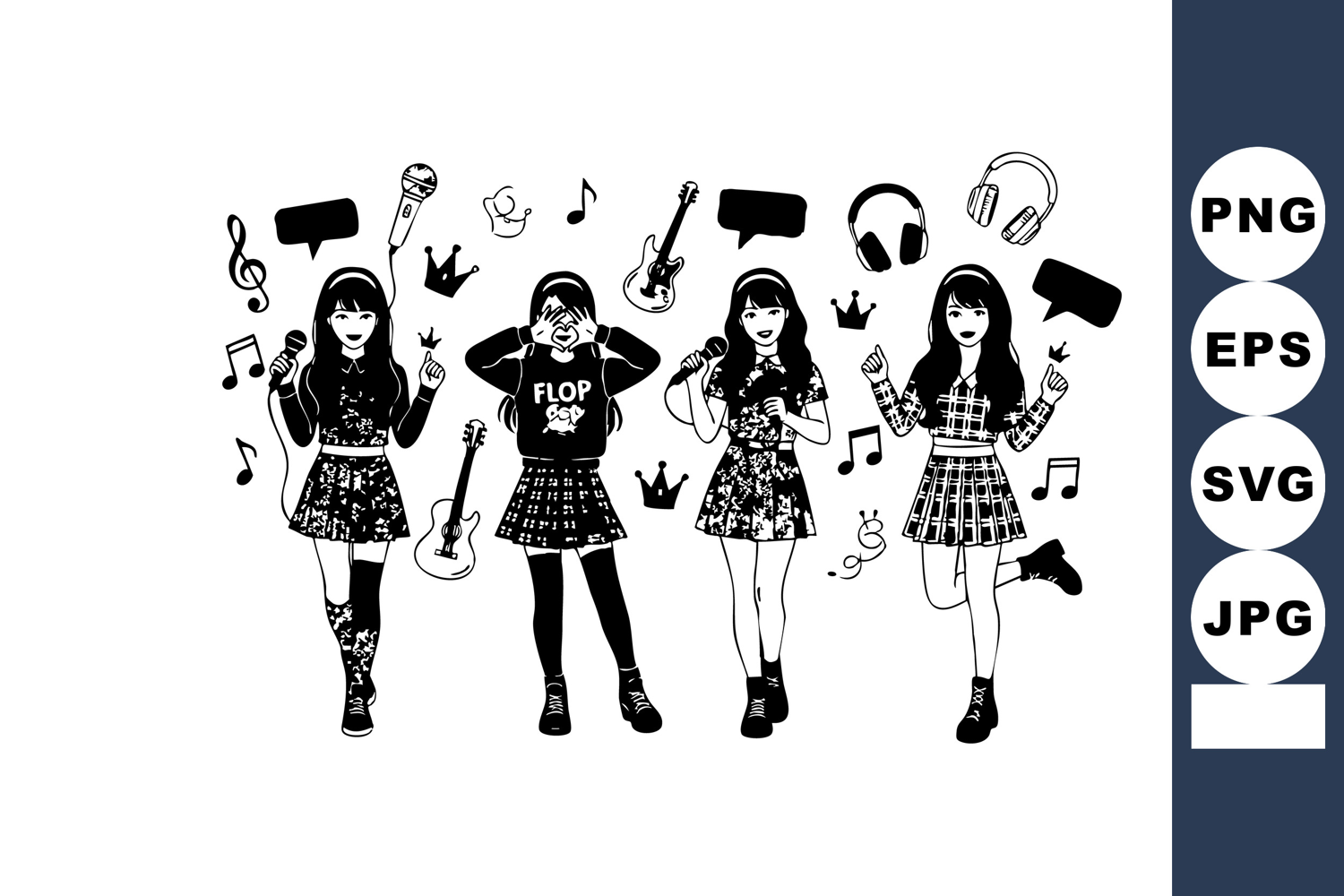 Four girls dancing and singing with music notes in black and example image 1