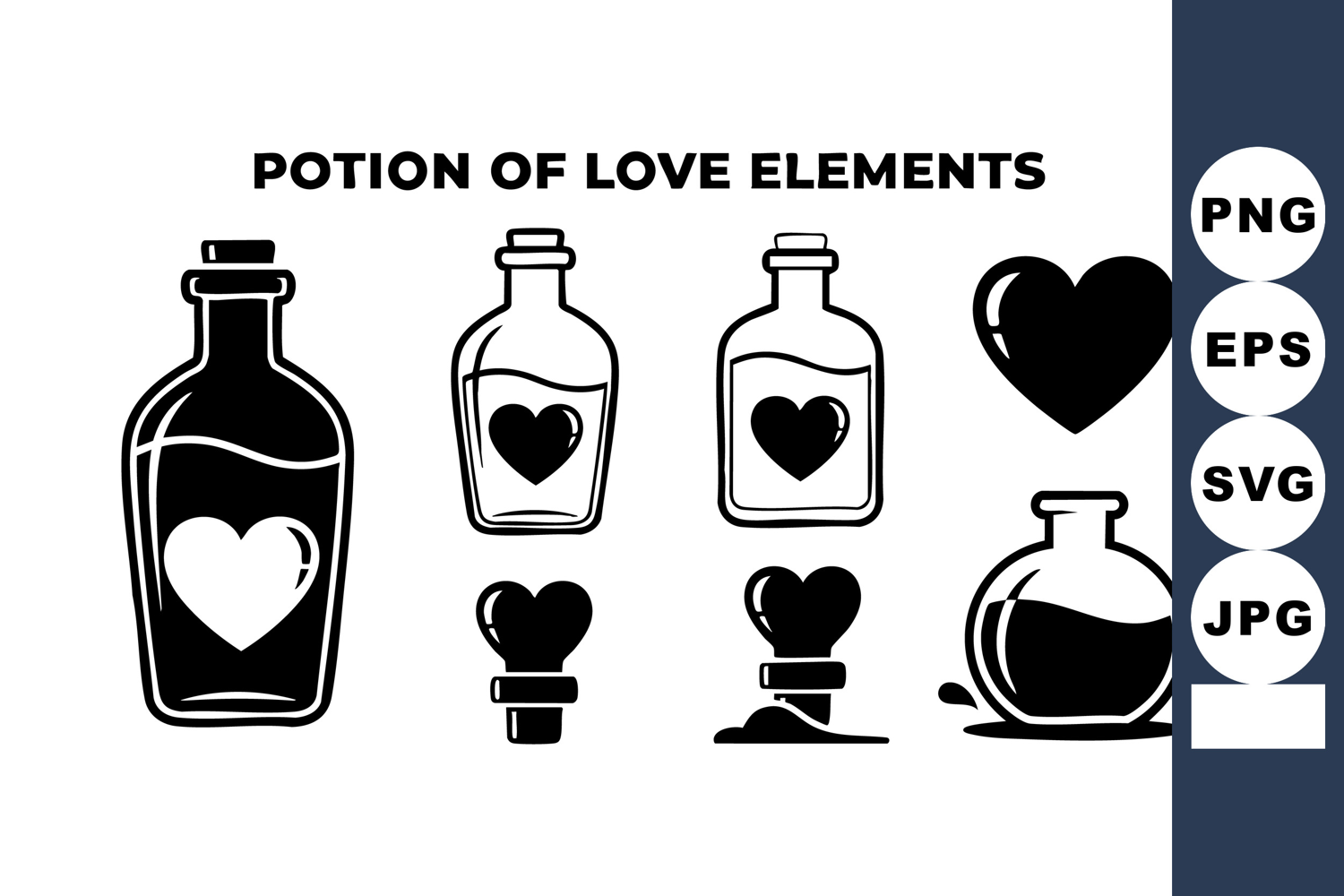Vector illustration displays potion bottles and heart shapes in black and white with simple clean lines, creating a romantic and charming mood.