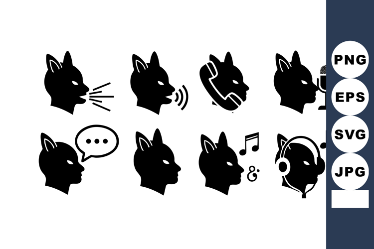 Set of black silhouette dog head icons showing communication, sound, music, and voice concepts in a clean vector style. Clear and expressive mood.