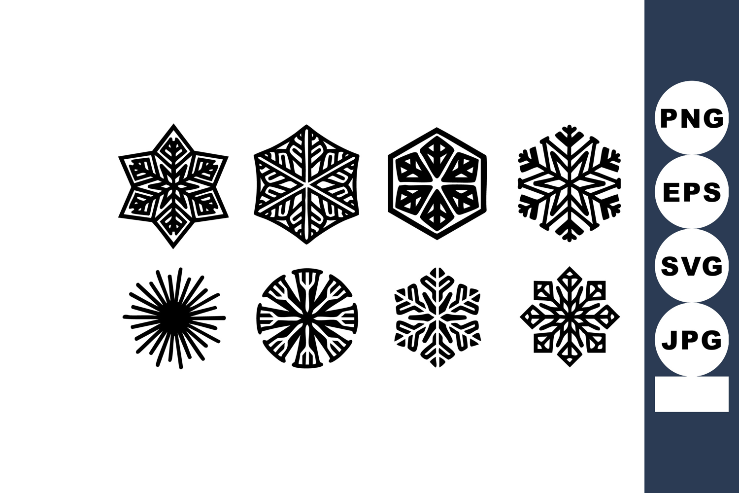 Eight black and white symmetrical snowflakes with intricate geometric winter patterns in a vector style. Minimalistic and elegant mood.
