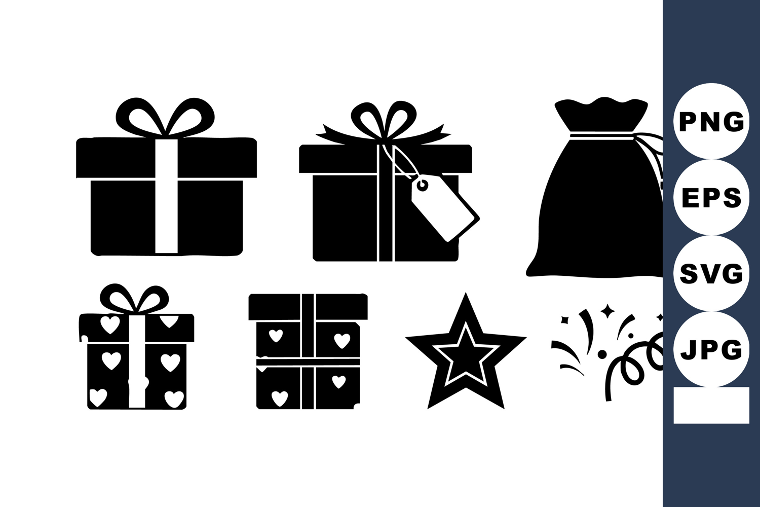Vector icons display various gift boxes with ribbons, a sack, a star, and festive confetti in black silhouette style. Cheerful mood.