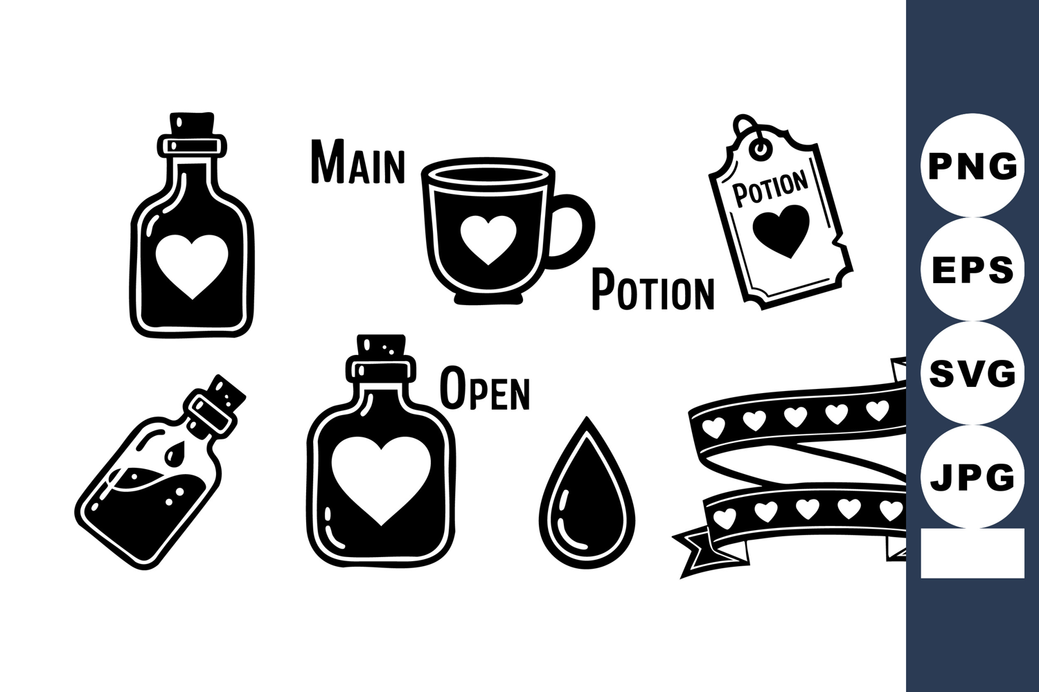 Vector illustration features heart-themed potion bottles, a cup with a heart label, a drop, and heart-decorated ribbons in black and white, simple style, charming.