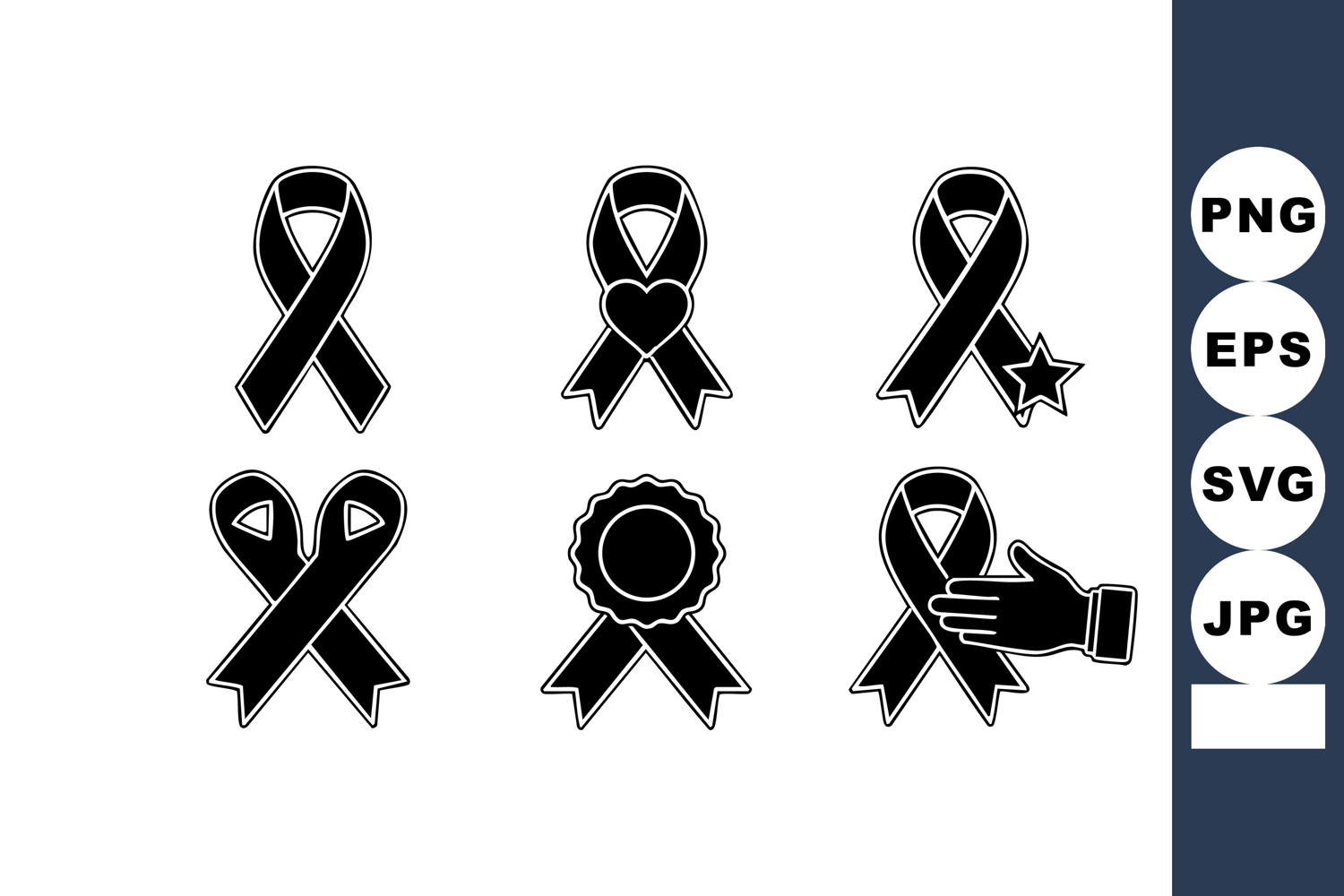 Vector illustration shows six awareness ribbons with heart, hand, star, and award symbols in black and white style, presenting hope and support mood.