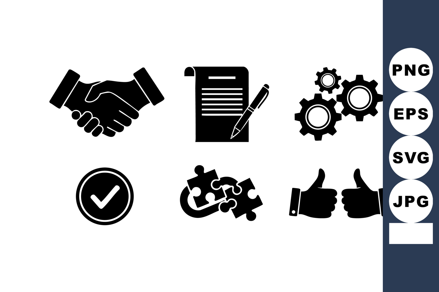 Set of black business icons showing handshake, contract, checklist, puzzle, gears, and thumbs up in vector style with clear silhouette, professional mood.