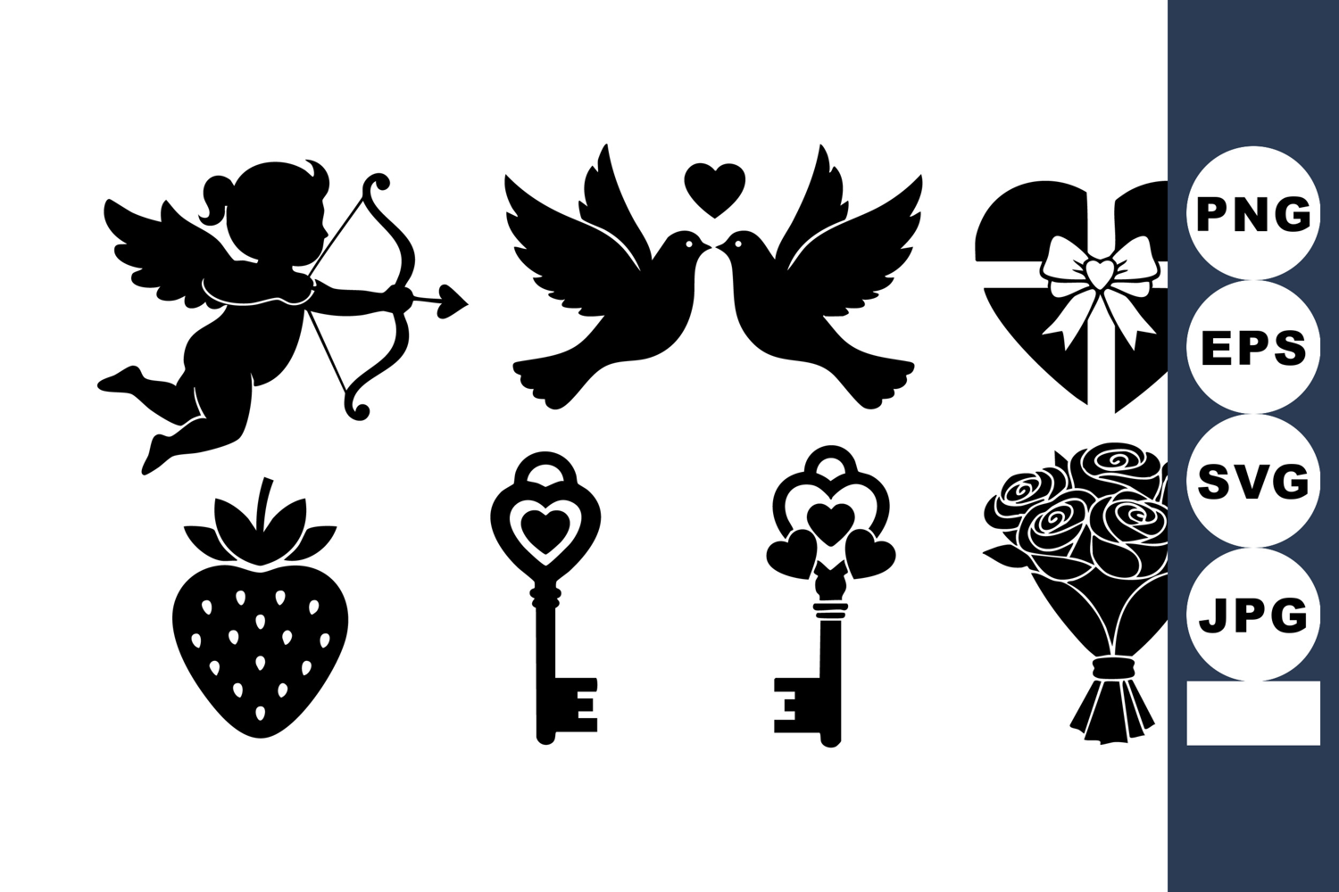 Vector illustration shows cupid with bow, two doves with heart, heart gift box, strawberry, keys, and rose bouquet in black silhouette style. Romantic mood.