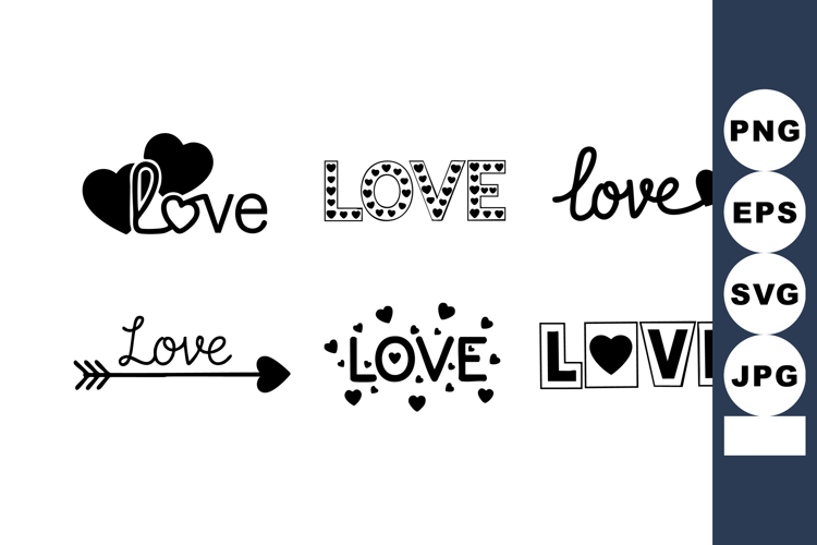 This vector image shows six different black and white love word art designs with heart shapes in a clean style. Romantic and playful mood.