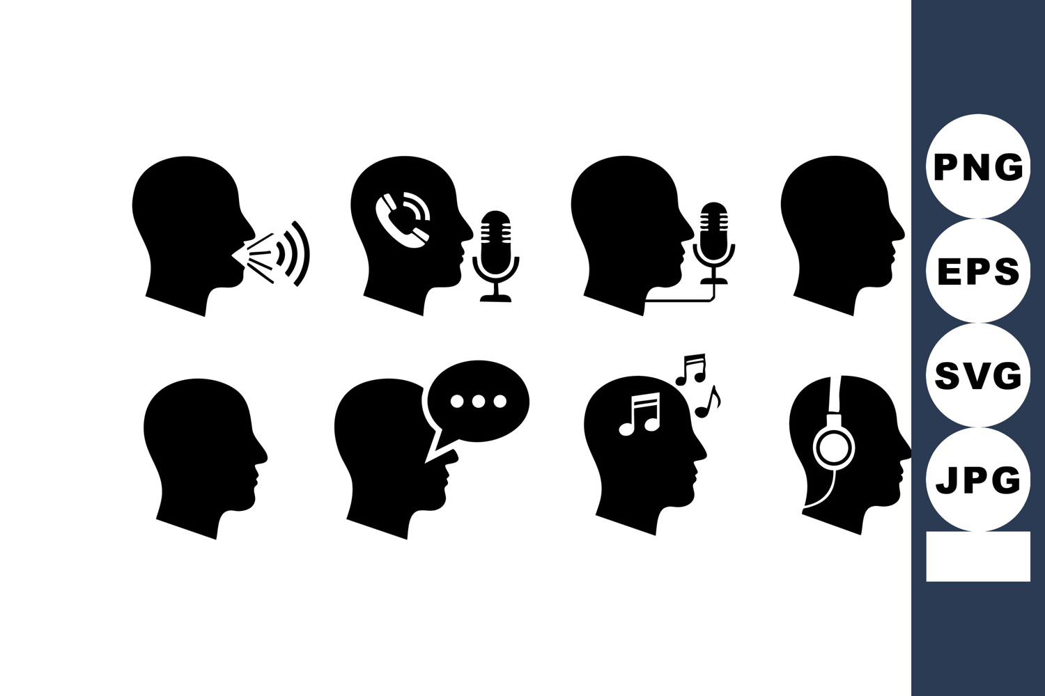 Silhouettes of human heads illustrate speaking, listening, audio recording, music, and conversation using microphones and headphones. Clear and engaging mood.
