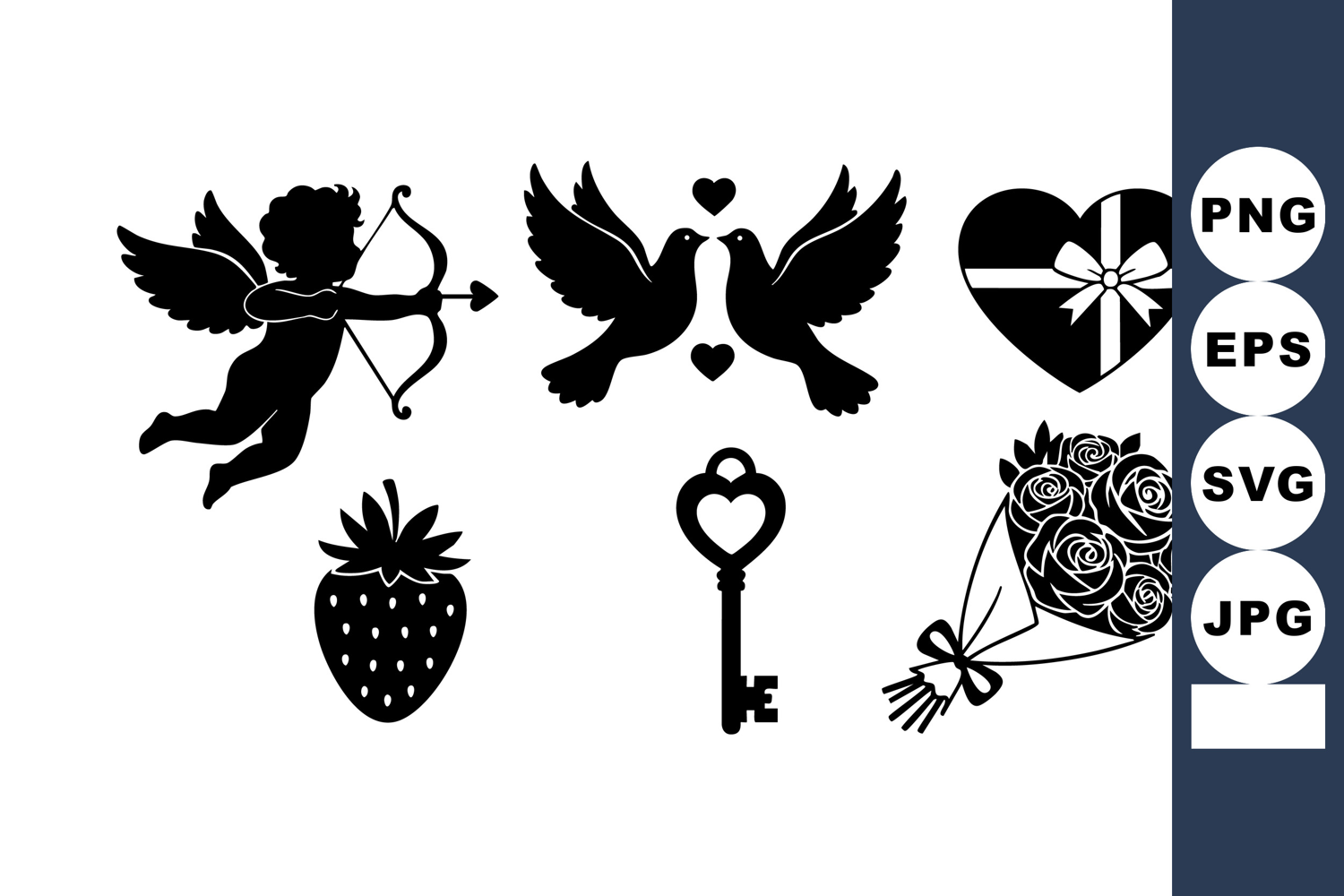 Vector illustration shows Cupid cherub aiming bow, two doves kissing, heart with bow, strawberry, key, and rose bouquet in black silhouette style, romantic mood.