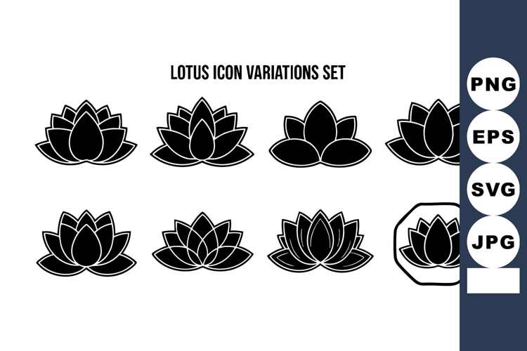 Set of black silhouette lotus flower icon variations displayed in a clean vector style, suitable for design projects, calm and balanced mood.