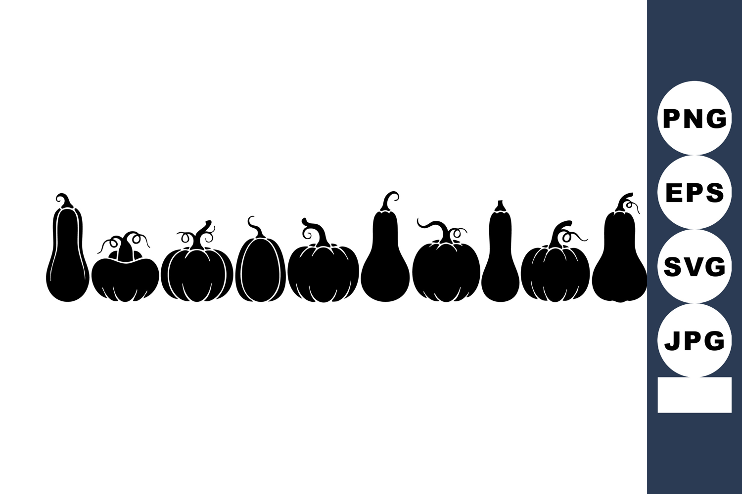 Black silhouette row of various pumpkin and gourd shapes vec example image 1