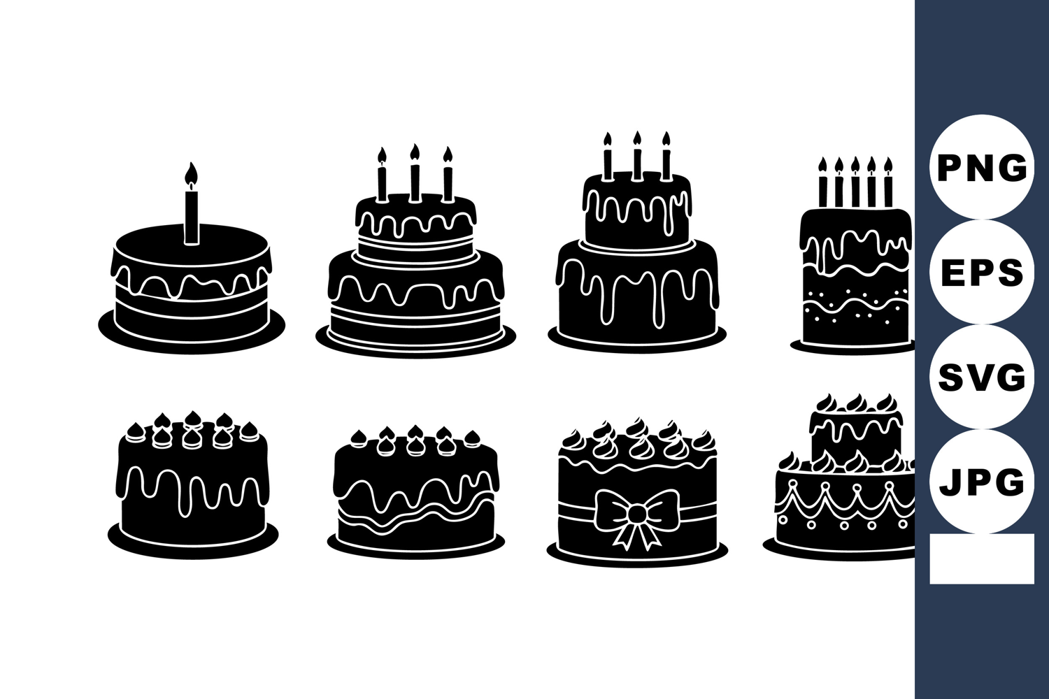Vector illustration showing eight different birthday cake icons with candles and decorative frosting in black silhouette style. Festive and celebratory mood.