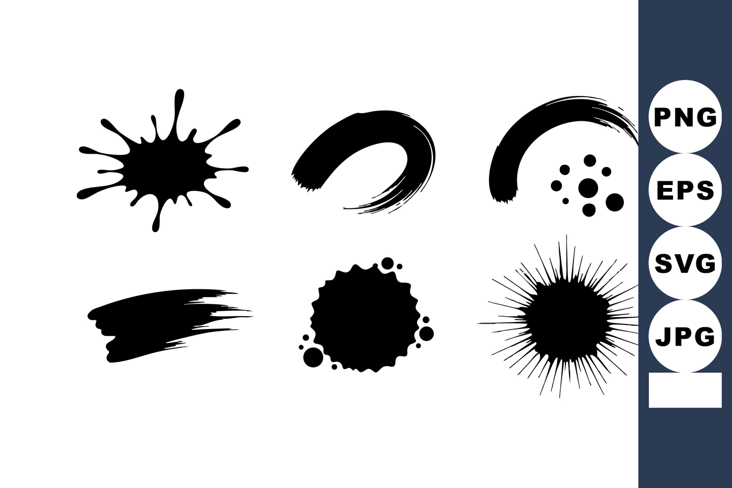 This vector image shows six unique black ink splatter and brush stroke designs in various shapes for creative use, artistic and versatile. Calm and creative mood.