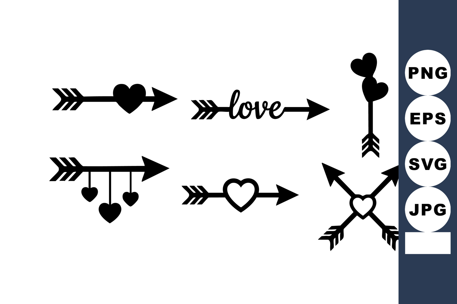 Vector set shows black arrows with heart shapes and love text, creating romantic and affectionate symbols. Simple and elegant mood.
