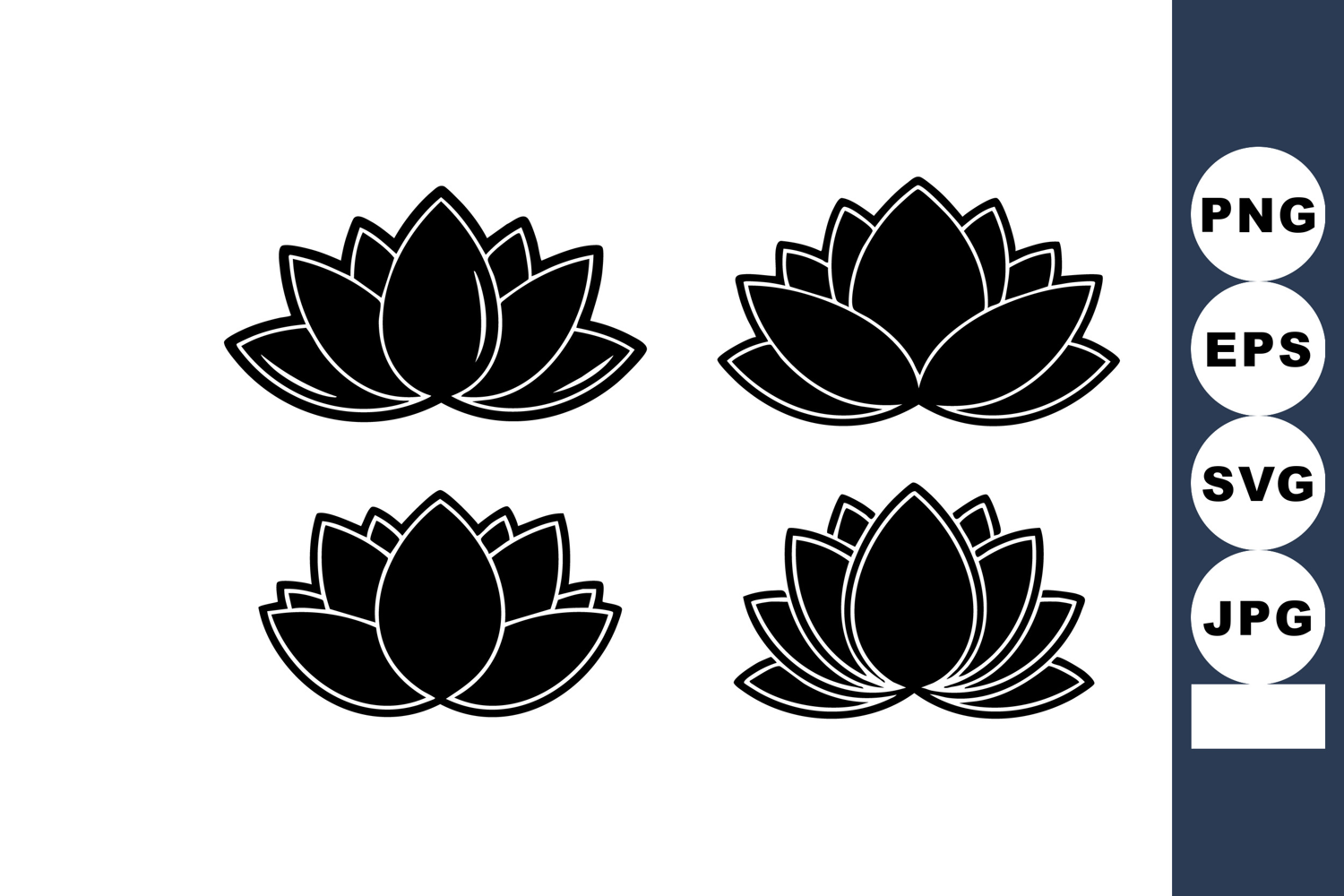 Four black lotus flower silhouettes with simple elegant shapes arranged in a set for versatile design use, creating a calm and balanced mood.