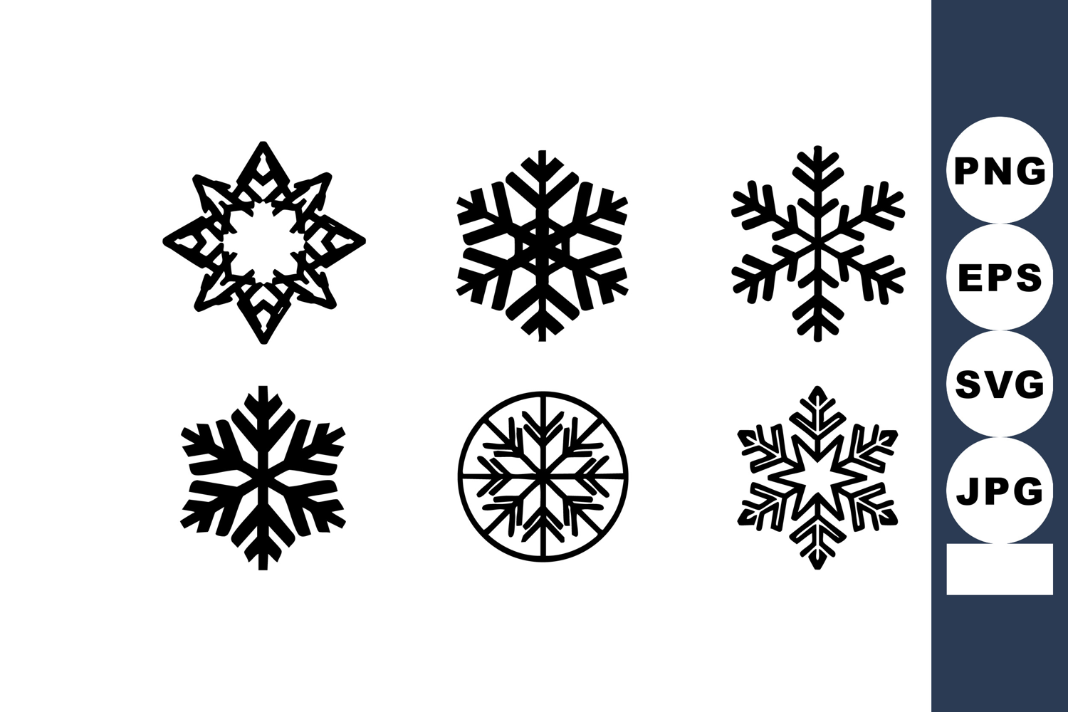This vector features six black snowflake icons representing winter season with detailed symmetrical patterns, conveying a festive mood.