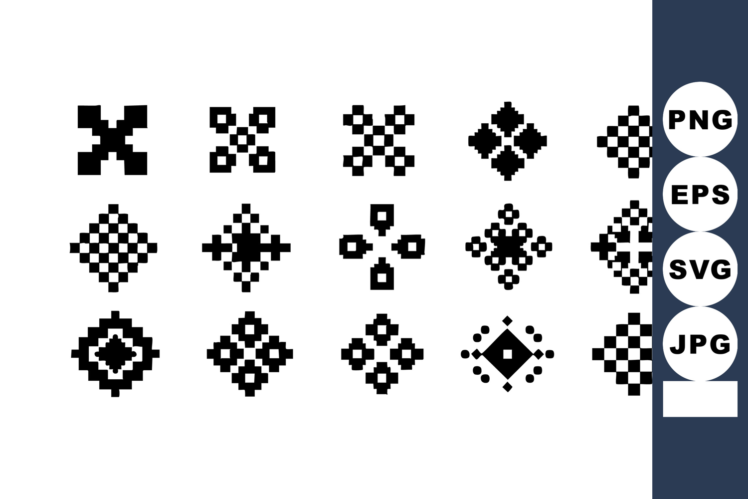 Set of black and white geometric pixel art icons with various symmetrical decorative patterns presented in a simple style. Minimalist and clear.