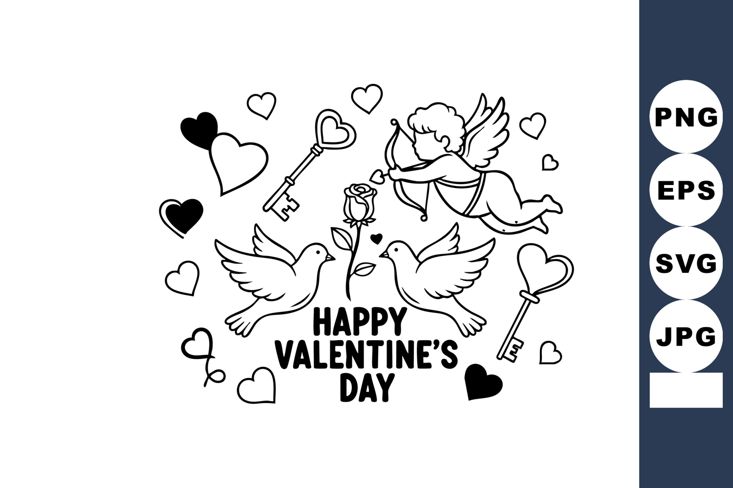 Illustration features cupid with bow, doves, hearts, keys, and rose around Happy Valentine’s Day text in black and white style, romantic mood.