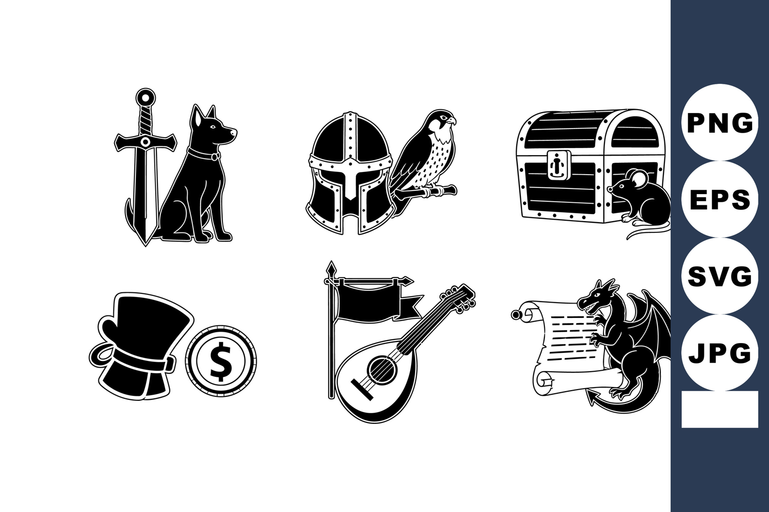 Black medieval sword, cat, helmet, falcon, treasure chest, coins, lute, flag, dragon, and scroll icons in vector style create a historic fantasy mood.