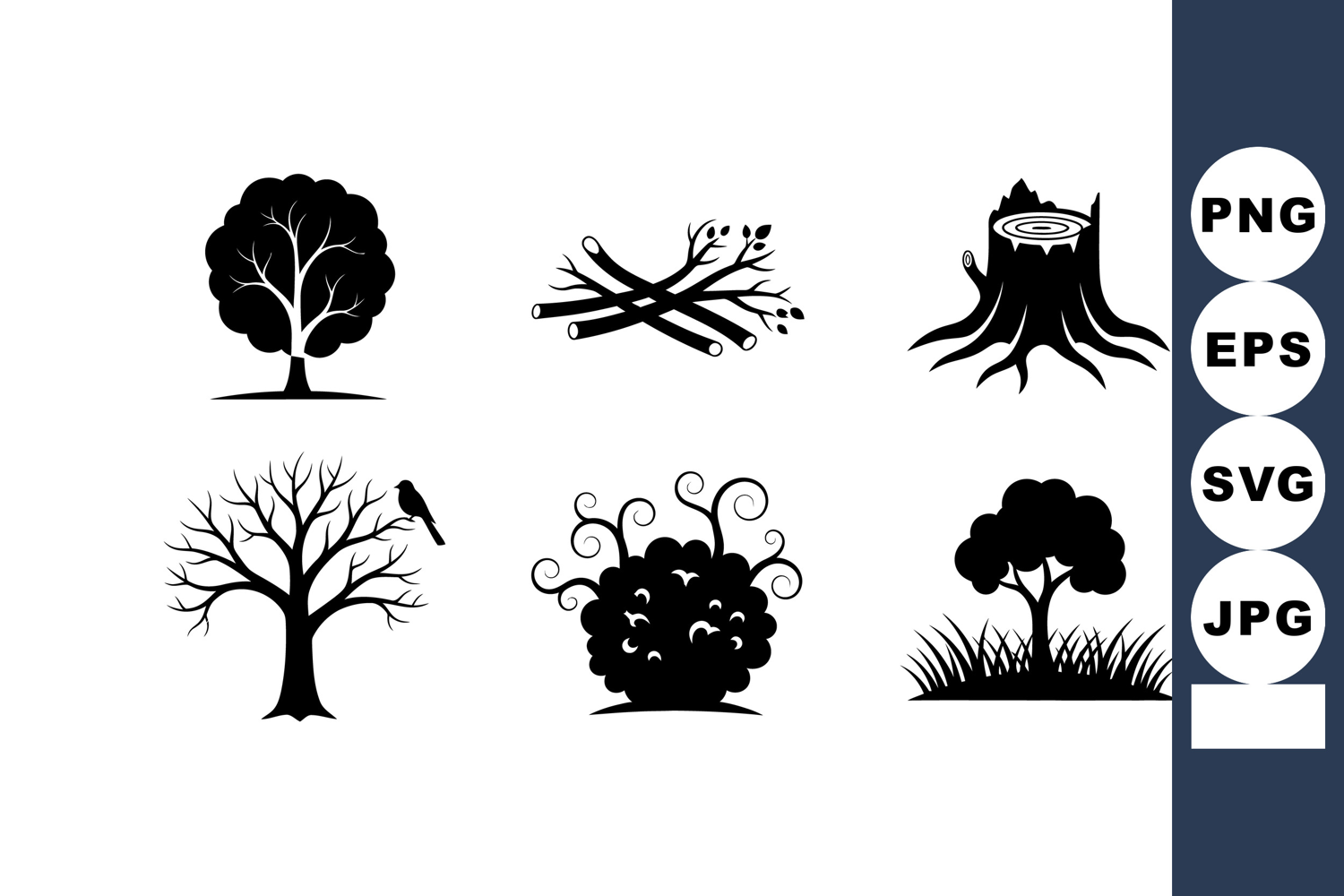Vector illustration shows six black tree silhouettes including branches, stump, bush, and grass in simple style. Calm and natural mood.