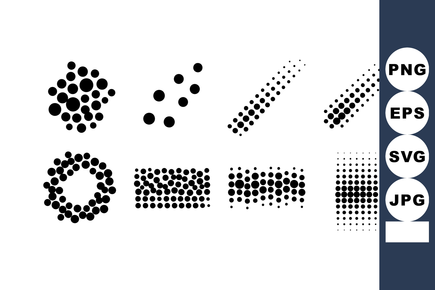 This vector features multiple halftone dot patterns in different shapes and densities, ideal for creative graphic design projects and digital artwork. Clean and versatile mood.