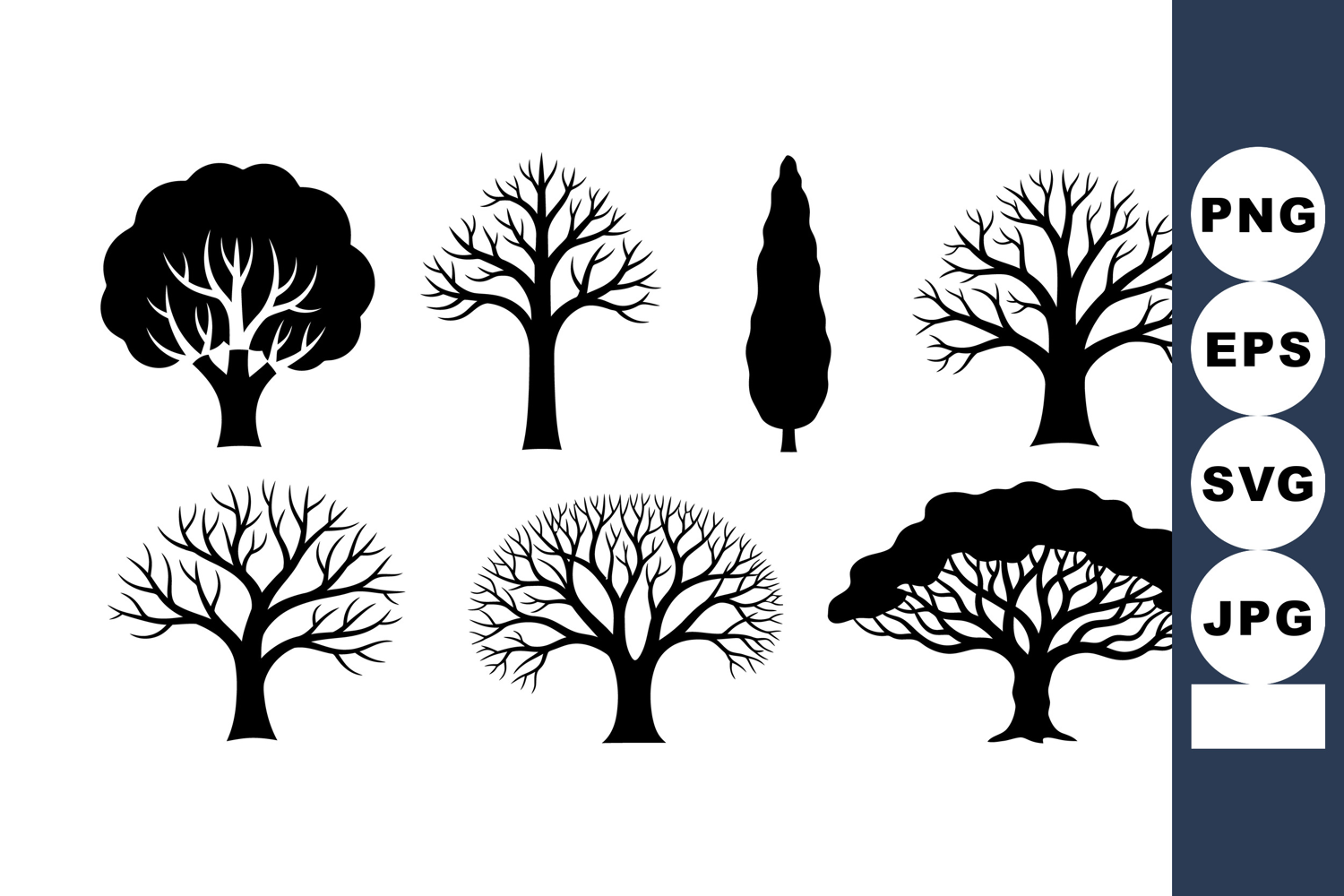 This vector set presents seven black silhouette trees in winter style with leafless branches, suitable for various design projects and creative uses. Calm mood.