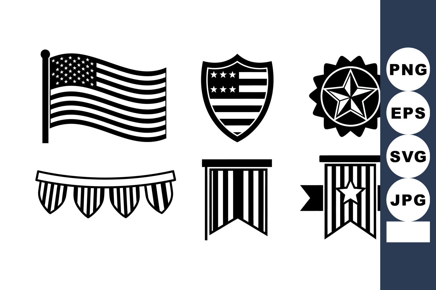 Vector icons of American flag, shield, star badge, and patriotic banners in black and white, representing national pride and symbolism. Patriotic mood.