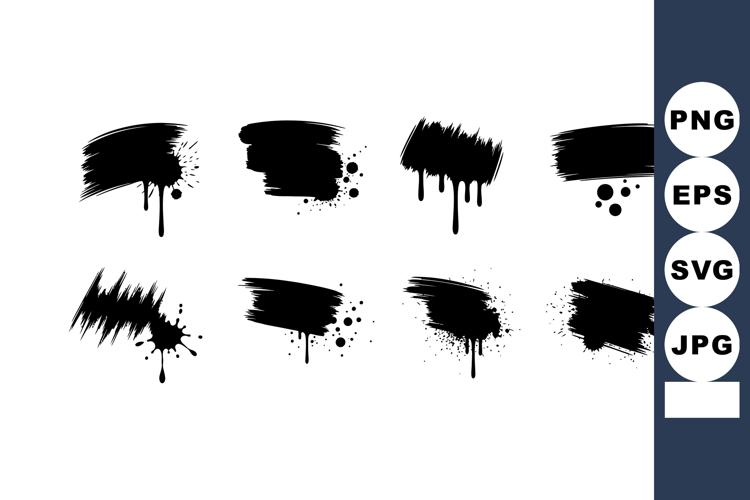 This vector shows eight black ink splatter brush strokes with drips, perfect for artistic and graphic design projects, creative and dynamic.