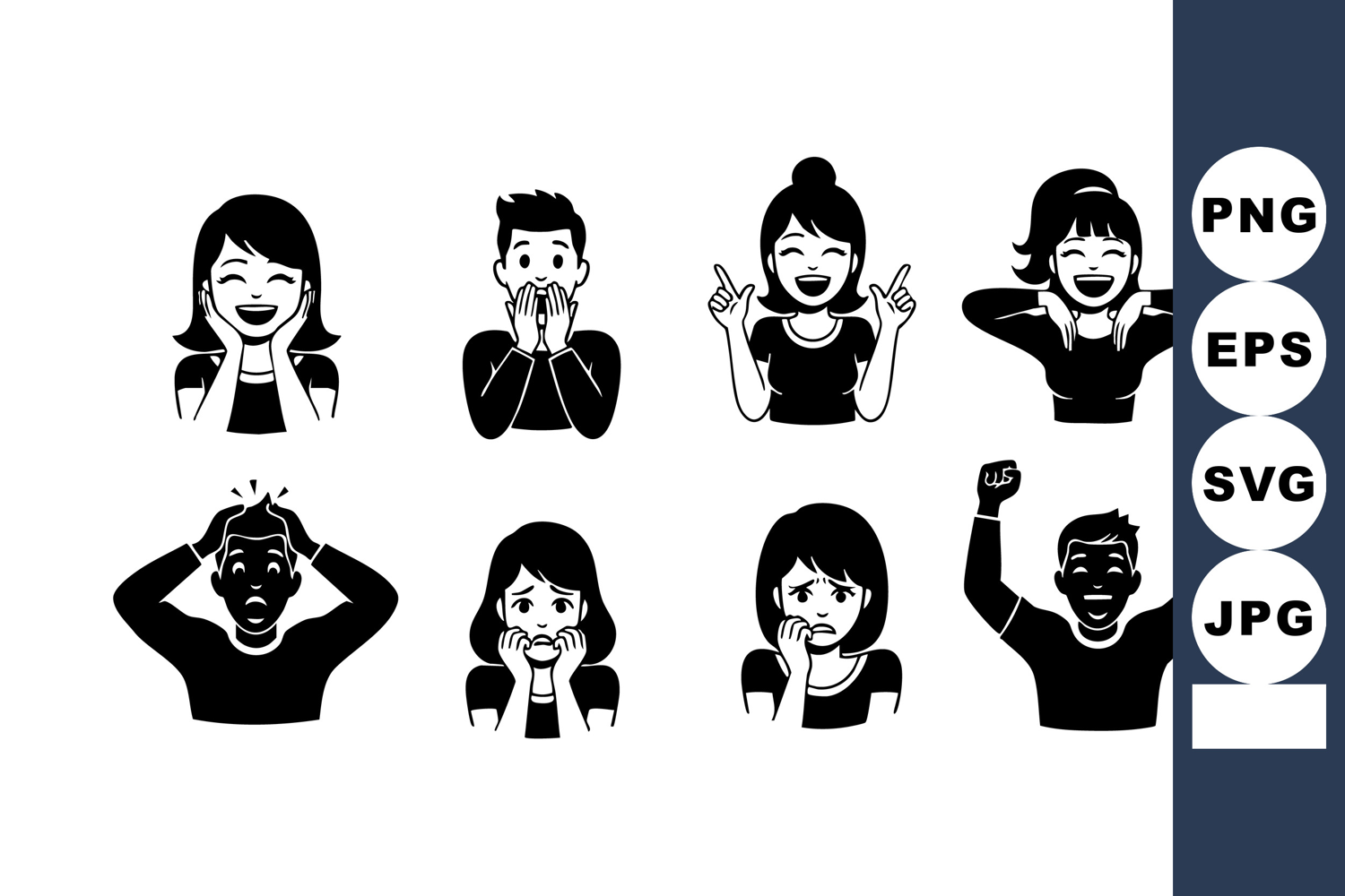 This vector shows diverse emotional expressions of people in black and white, illustrating various moods and feelings with clear contrast, creating an engaging atmosphere.