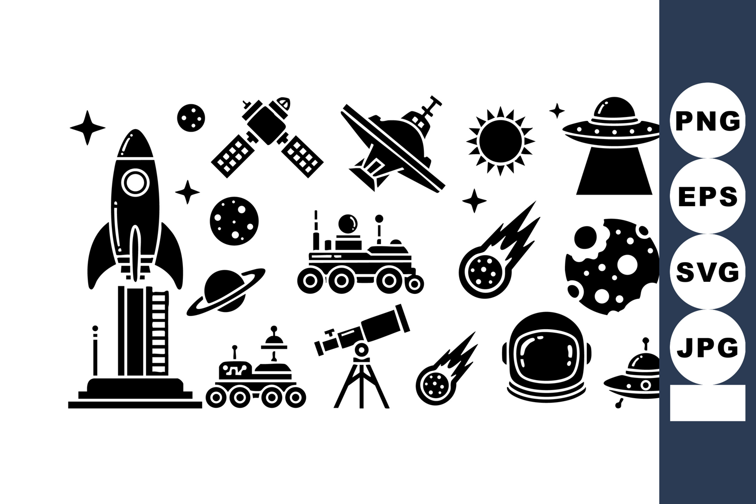 Vector set shows space exploration icons including rocket, satellites, planets, rover, telescope, astronaut helmet, and meteor in black silhouette style, creative mood.