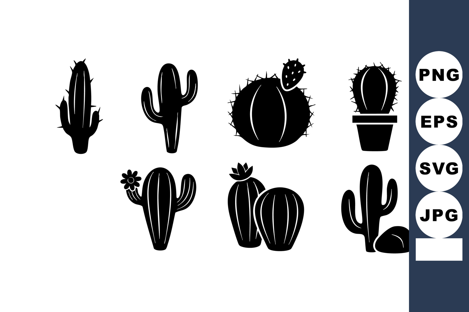 Collection of black cactus silhouettes representing different desert plants and succulents in simple vector style, creating a bold botanical mood.
