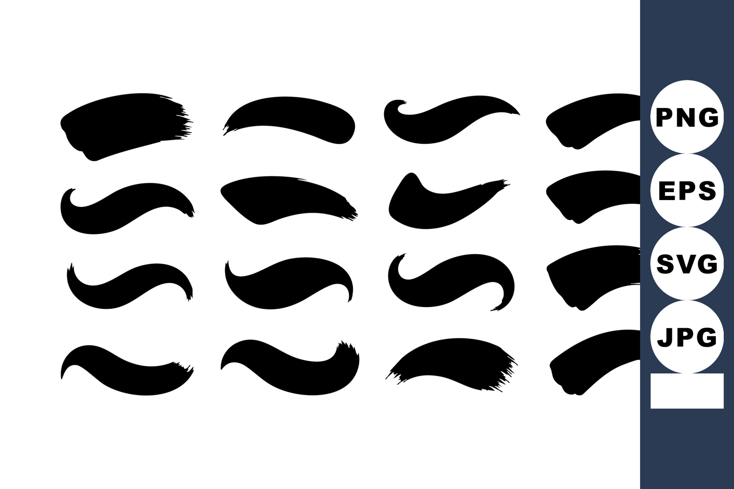 Collection of black brush strokes in various shapes and sizes for artistic and graphic design use, creating dynamic visual effects, creative mood.