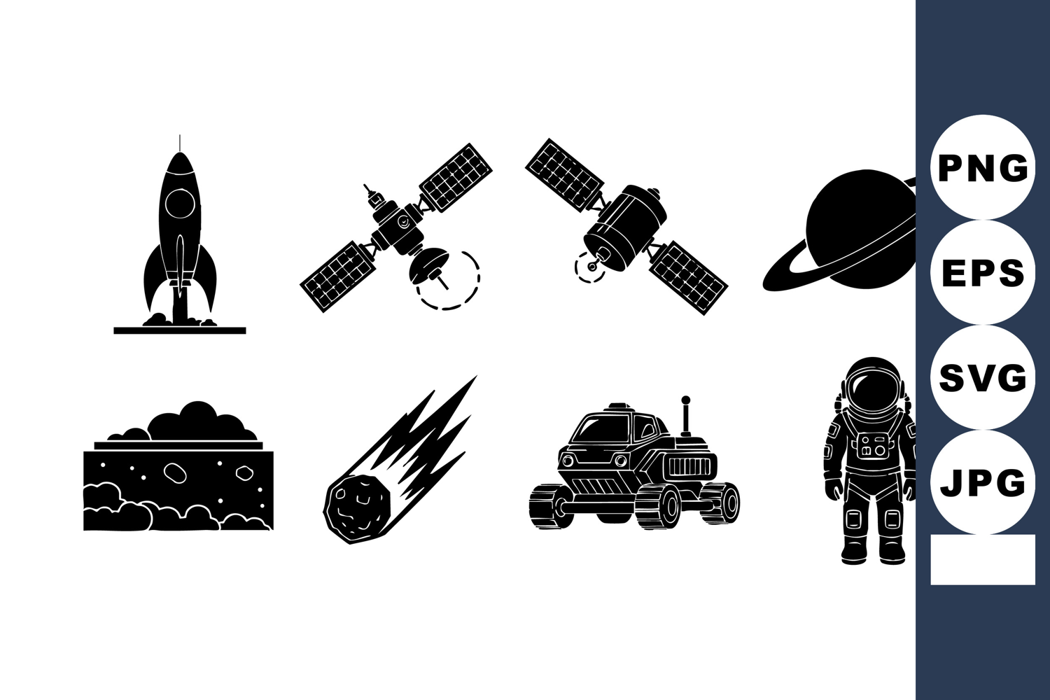 Set of black space exploration icons including rocket, satellites, astronaut, planet with rings, meteor, and rover in silhouette style, clear and bold. Calm mood.