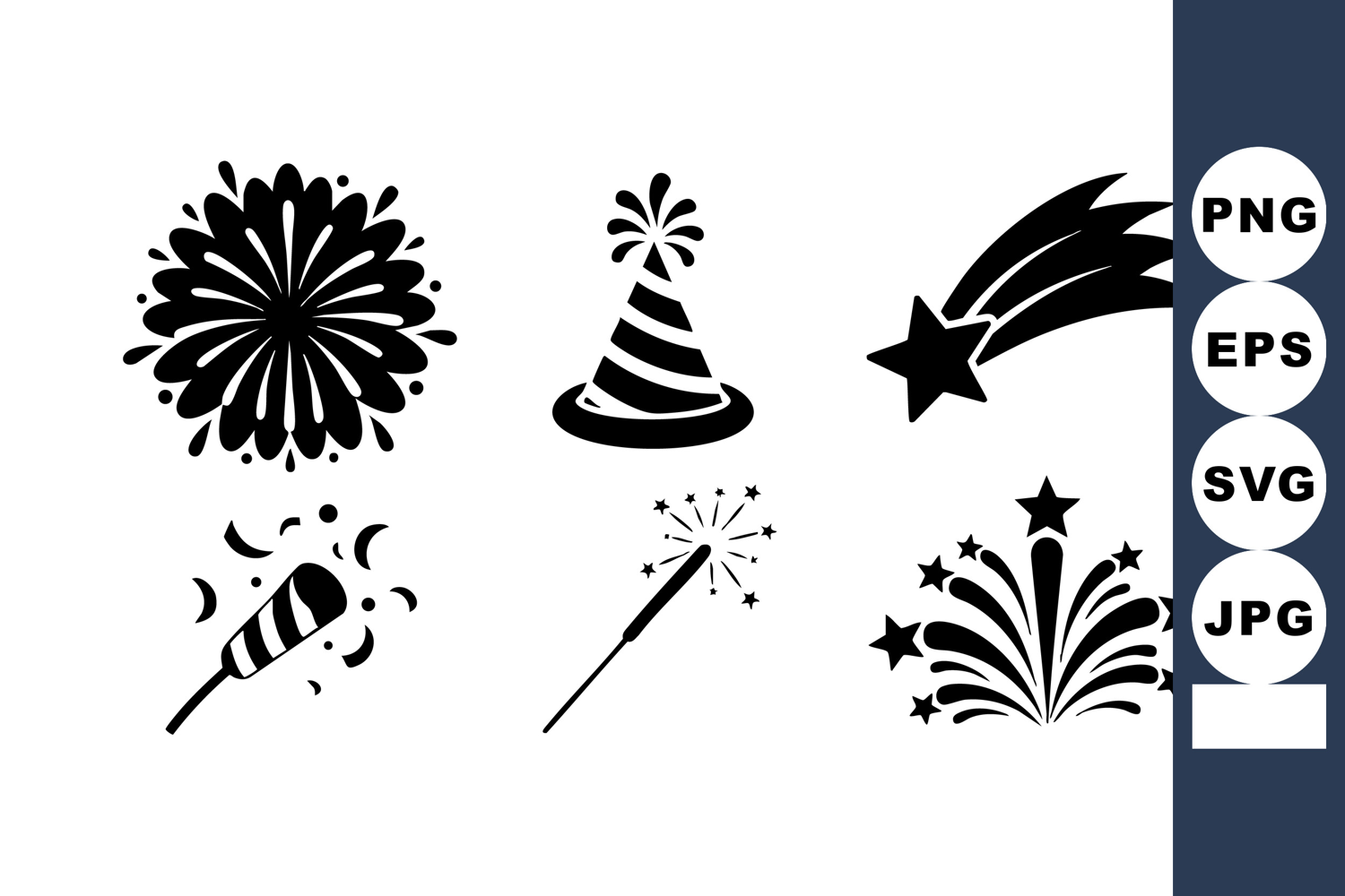Vector illustration shows celebration icons including fireworks, party hat, magic wand, and star shapes in black silhouette style. Festive mood.