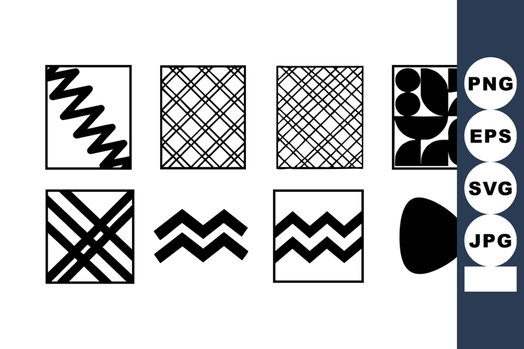 This vector illustration shows eight black and white geometric shapes including zigzag and grid patterns. The style is modern and minimalistic, calm mood.