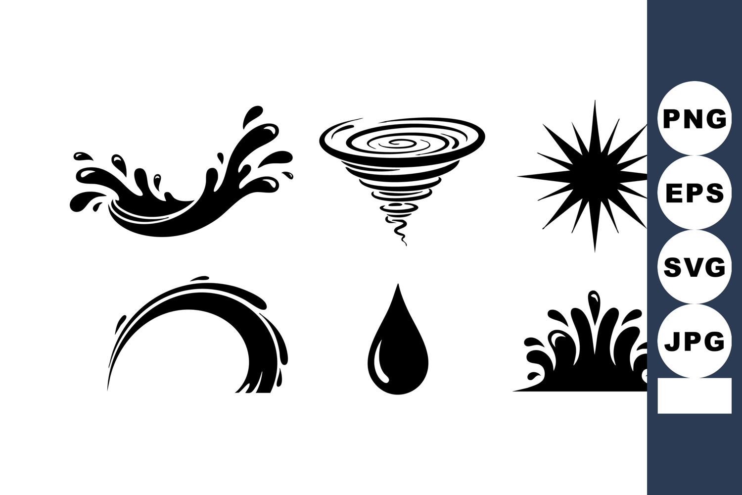 This vector set displays black silhouettes of water splash, droplet, tornado, and sunburst icons in a clean, simple style. Calm.