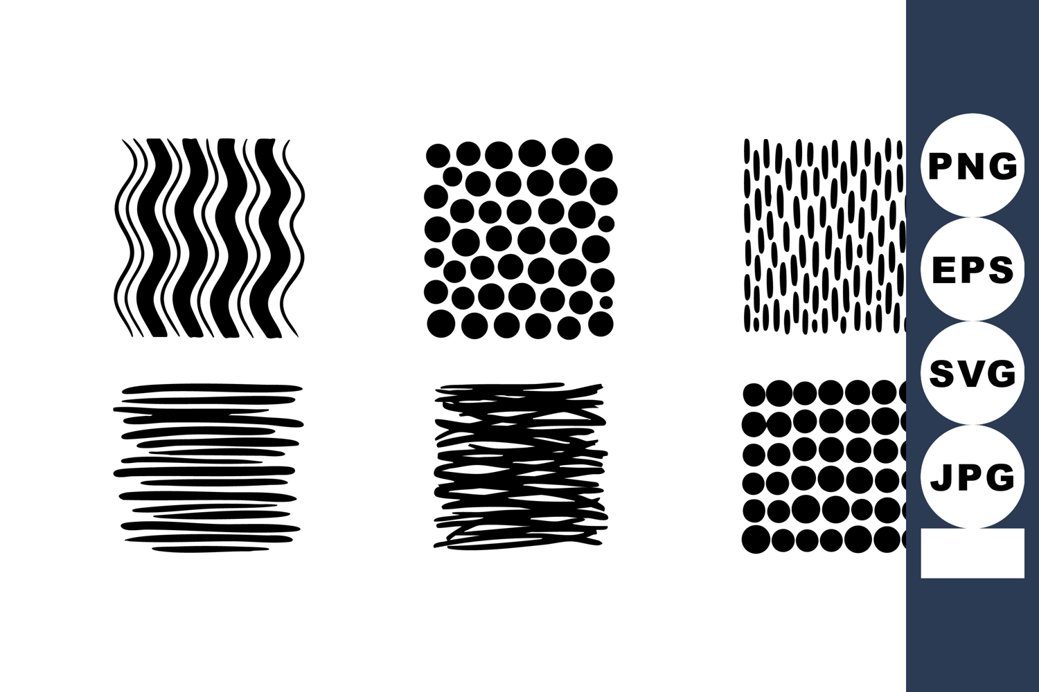Vector shows six black and white abstract patterns with wavy lines, dots, and stripes in a minimalist style. Clean and modern mood.