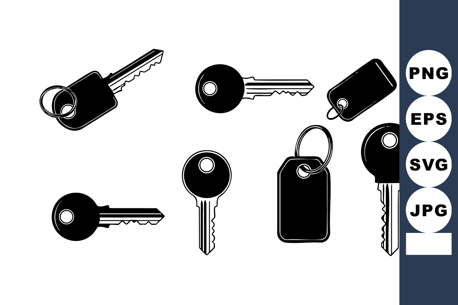Vector illustration shows seven black and white keys and keychains in simple style, arranged on white background, clean and minimalistic mood.