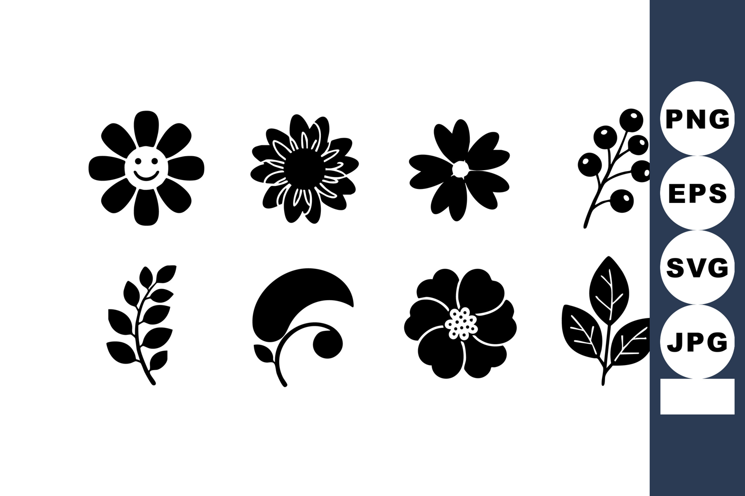 This vector features black and white flower and leaf icons including a smiling face flower in a simple illustration style. Cheerful mood.