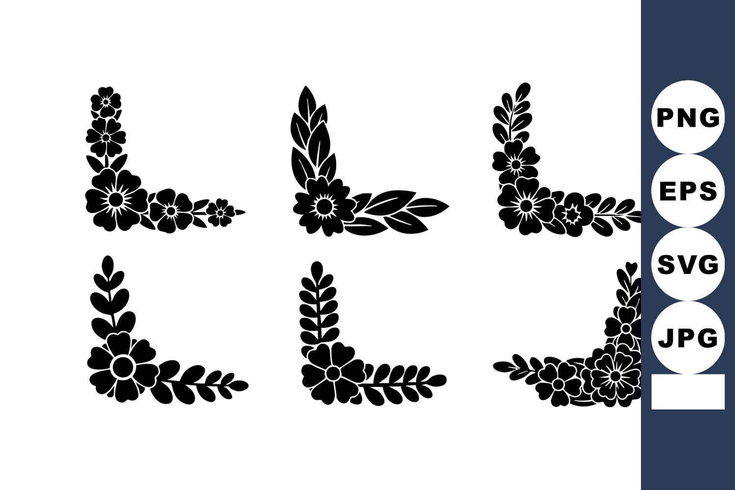 Set of six black floral corner designs with detailed leaves and flowers in silhouette style for decoration and design projects. Elegant mood.