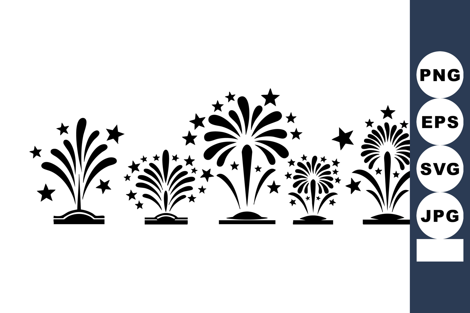 Fireworks burst in various shapes with stars above, designed in black silhouette style, creating a festive and celebratory mood.