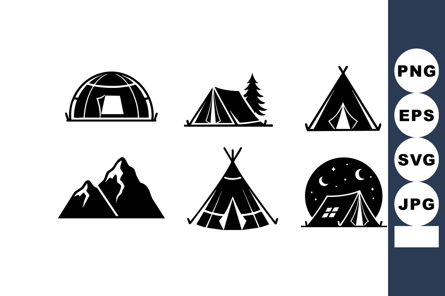 This vector shows various camping tents, mountains, a tree, and a night sky with moon and stars in black silhouette style, peaceful mood.
