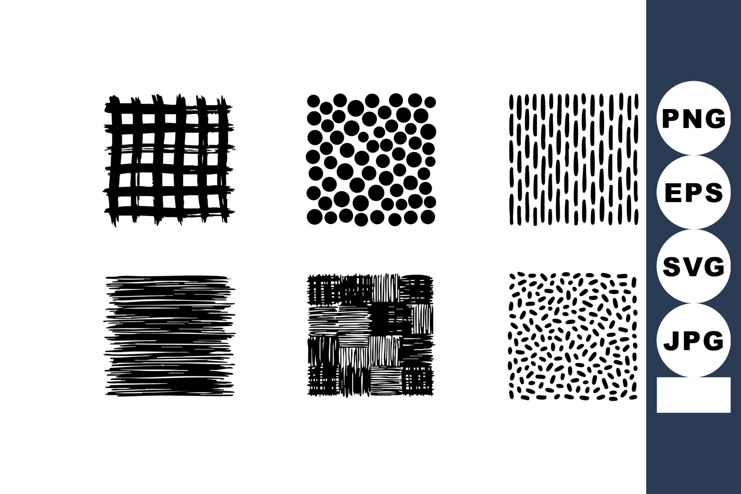 This vector illustration presents six black and white abstract patterns with geometric shapes and brush stroke textures in a clean layout. Minimalist mood.