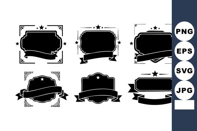 This vector illustration presents six black vintage label badge designs with ribbon banners in various shapes, perfect for decoration and branding, elegant.