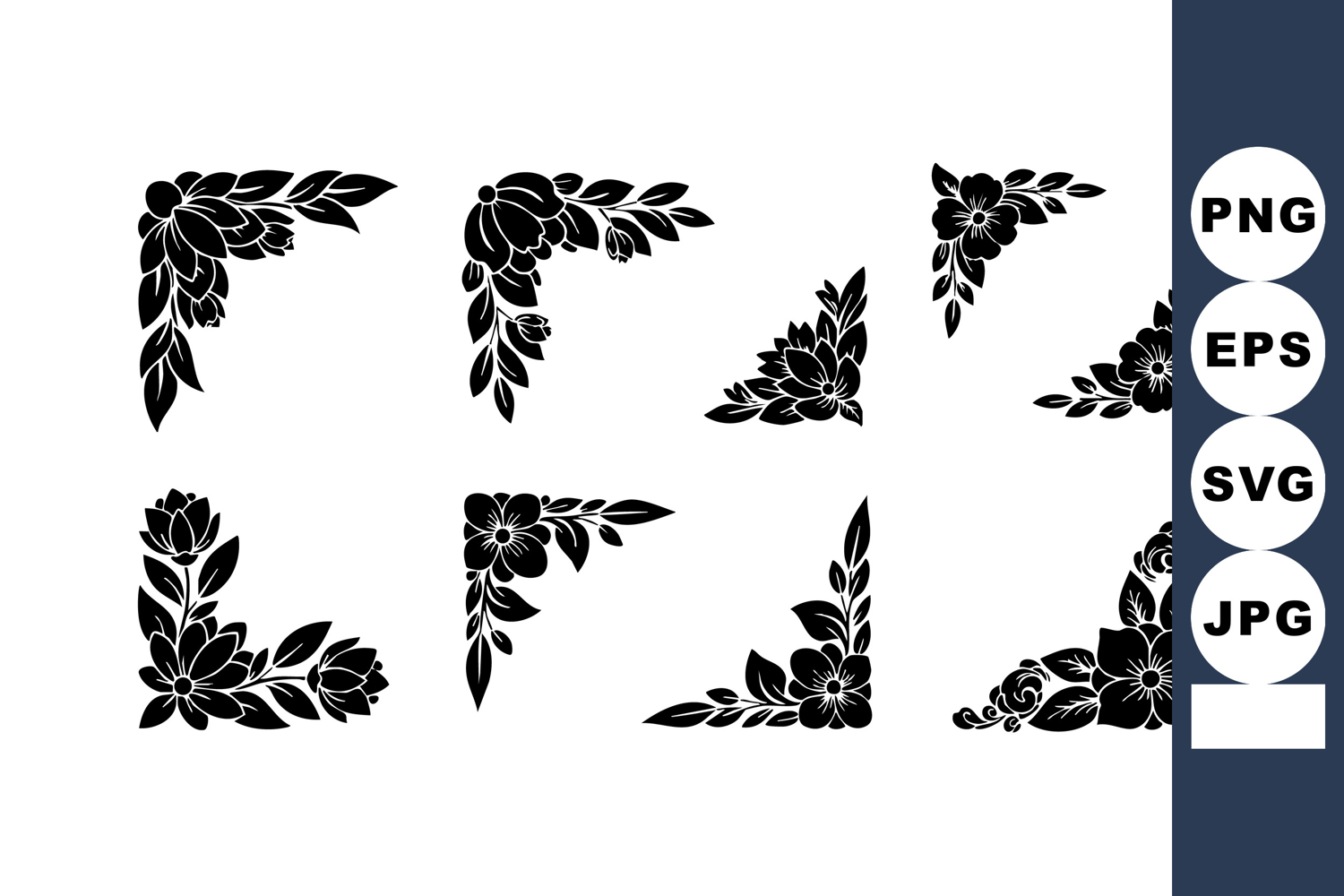 This vector set features decorative black floral corner elements with leaves and flowers in silhouette style, suitable for design projects, elegant mood.