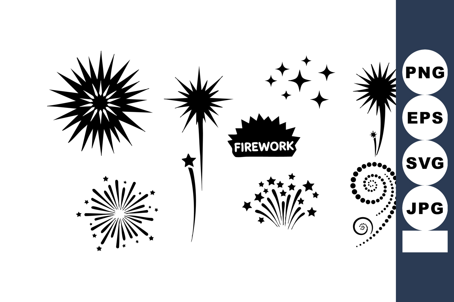 Vector illustration features various fireworks shapes with starbursts, sparkles, and spirals in black silhouette style, creating festive and dynamic mood.