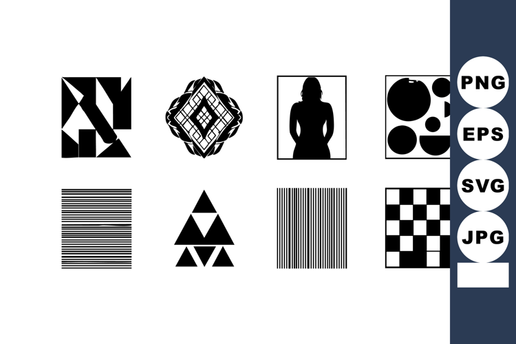 Vector set presents abstract geometric shapes and silhouette in black and white, offering modern design elements with high contrast and clarity, minimalistic and bold mood.